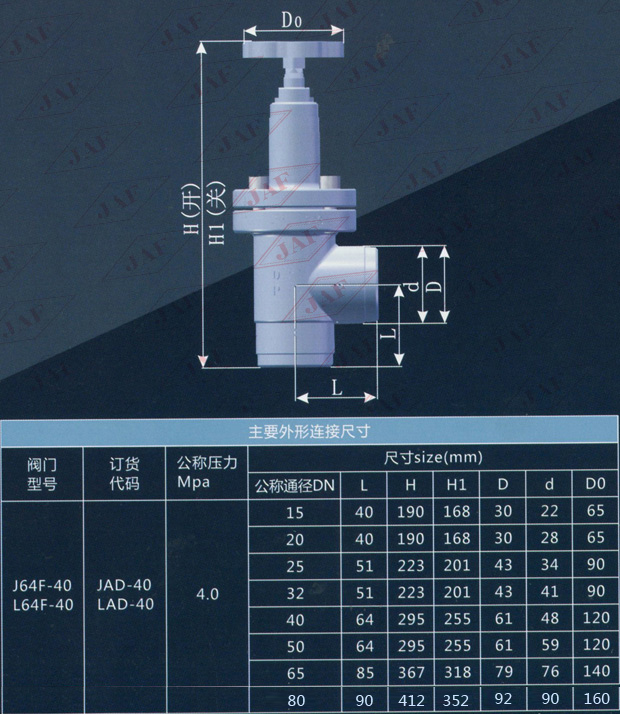 適用范圍 適用于公稱壓力為4.OMPa,公稱通徑為DN15~DN65閥體材料為鍛鋼的對(duì)焊直角截止閥和節(jié)流閥?! ¢y門屬性 公稱壓力為4.OMPa,試驗(yàn)壓力為6.OMPa,適用溫度為-50°C-+200°C適用介質(zhì)為氨、氟等?! 表示截止閥 A表示結(jié)構(gòu)形式為直角式 D表示對(duì)焊連接 40代表公稱壓力為4.0MPa 40后不標(biāo)注表示閥體材質(zhì)為鍛鋼。