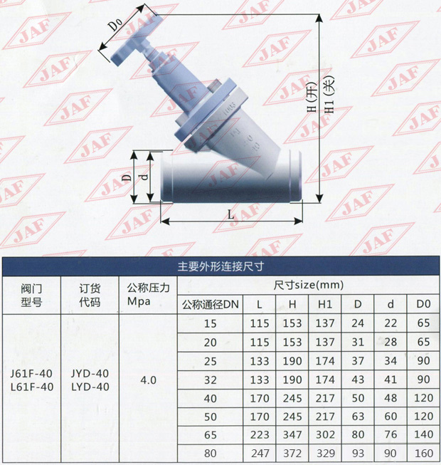 J表示截止閥 A表示結構形式為直角式 D表示對焊連接 40代表公稱壓力為4.0MPa 40后不標注表示閥體材質(zhì)為鍛鋼。